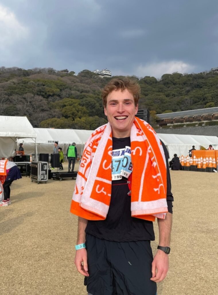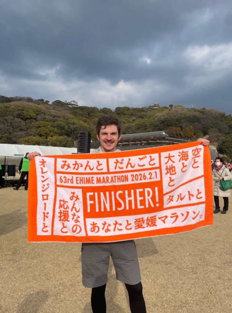 “I’d heard about the Ehime marathon last year; it seemed like quite a notable local event than many people discussed, and I was pleased to hear that some ALTs had even ran it before! Running a marathon had always been an ambition of mine, having gotten into running as an excuse to get outside more during COVID-19, and the year before I came to Japan, I ran my first half-marathon around Victoria Park in London. I’d continued the habit here in Japan, running up and down the Ishite river every weekend, so it seemed natural that if I was going to elevate the habit into an achievement, then the Ehime marathon was the perfect opportunity; not just to run the length of a marathon, but to get involved in a big community event that I could talk to my Japanese colleagues and students to!”