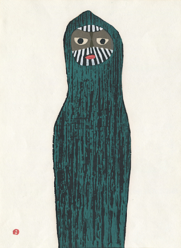 The relationship of Azechi’s postwar work to its medium is all-encompassing. As the artist began experimenting with greater degrees of abstraction, the figures and landscapes he depicts seem almost to take on the qualities of the wood they are printed with. Fully articulated human figures become looser, further simplified, as if built from wood themselves. In「雪の中の男」(yuki no naka no otoko, 1958) a ‘mountain man’ stands upright, his face emerging from a succinct and limbless body. We can make out the swell of his shoulders below the neck, but, ultimately, his form is concealed. His arms presumably obscured under warm winter clothing, the Man in the Snow’s limbless figure, itself rendered with wood-grain texture, becomes totemic. Upright posture, watchful eyes, and a neutral expression recall 埴輪 (haniwa) figures of the Kofun Period (4th-6th century CE).