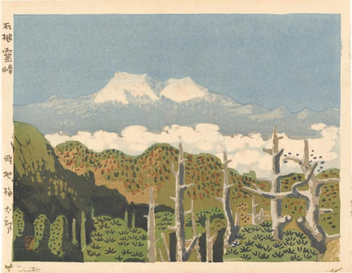 The peak’s elevation of 1,982m is also its topographic prominence, meaning no point on Shikoku or all of Japan to its west stands higher. That is to say, Ishizuchi is an impressive mountain. Of all Shikoku’s people, very few can claim to be as familiar with Ishizuchi’s many faces as the printmaker and ‘mountain man’, Azechi Umetarō (畦地梅太郎). Born in southern Ehime’s Kita-Uwa district, in a town now subsumed by Uwajima city, his art practice led him to Tokyo in 1920, where he began working at the National Printing Bureau. The NPB, a government agency charged with producing Japan’s currency, stamps, and official gazette, allowed Azechi to begin experimenting seriously with printmaking. Using lead sheets, nails, and other materials available to him, Azechi built upon his practice and started exhibiting, which eventually led him to leave the NPB and pursue printmaking exclusively.