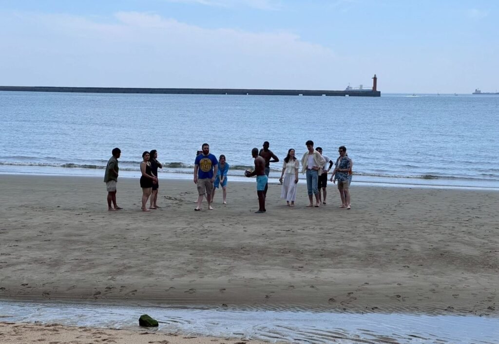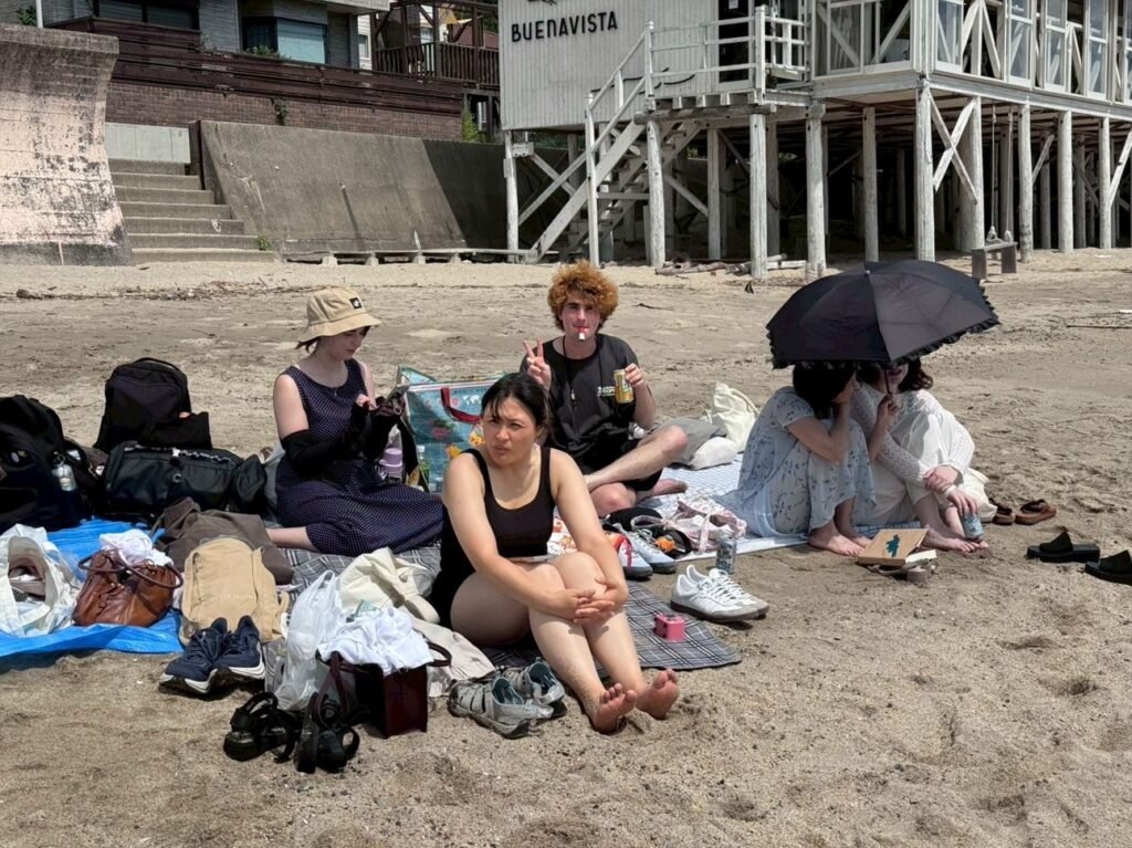 The event started around 1 PM on Saturday, July 12th where twenty of us piled out of the train and headed to Baishinji Beach. The weather was scorching, but the skies were clear, and the water was (most importantly) cool. Coupled with the blankets, beach gear, and delicious food/drinks, it made for a surprisingly comfortable day out. Some of us relaxed with good books under the shady canopy of colorful umbrellas, while others went out for a swim. There was even a swing nearby that made the flex even more tranquil. However, it wasn’t all sandcastles and beach towels. Once the volley ball was out friends became rivals in a spirited match that made a huge splash on an already great day out.
